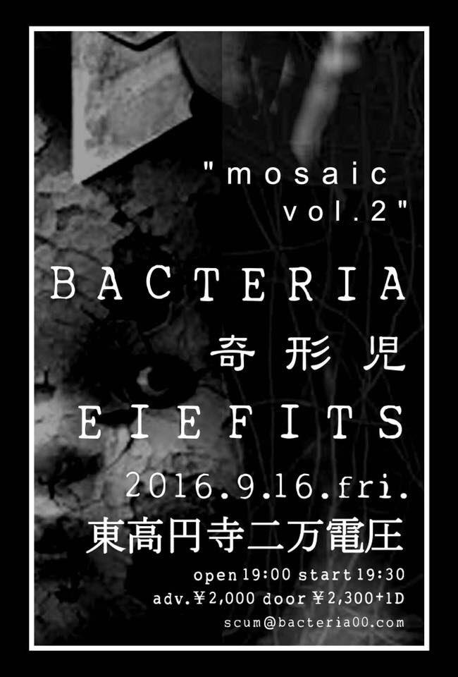 2016.9.16.fri 東高円寺二万電圧 “mosaic vol,2” 2016.9.16.fri 東高円寺二万電圧 OPEN.19:00 /START.19:30 ADV.2000yen /DOOR2300yen(+1D) BACTERIA 奇形児 EIEFITS Share information...TwitterFacebook