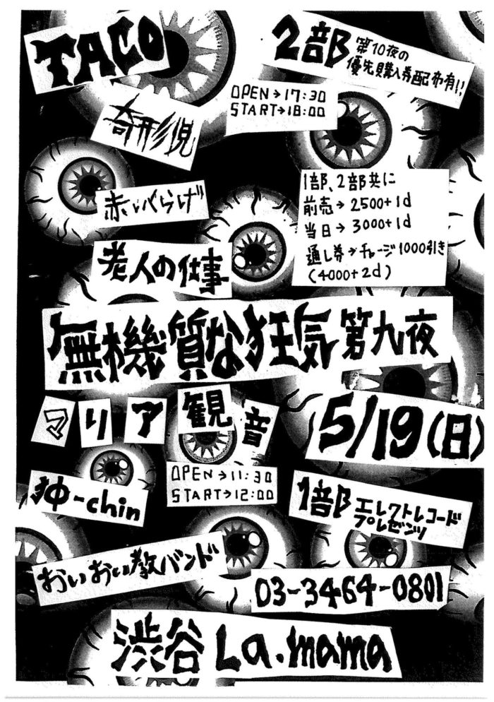 ライブ情報 5月19日(日) 無機質な狂気 第9夜2部 渋谷La.mama 開場17:30 / 開演18:00 前売り2500 / 当日3000 +1drink別 TACO (山崎春美など、T.美川入り) 奇形児 赤いくらげ 老人の仕事 Share information...TwitterFacebook